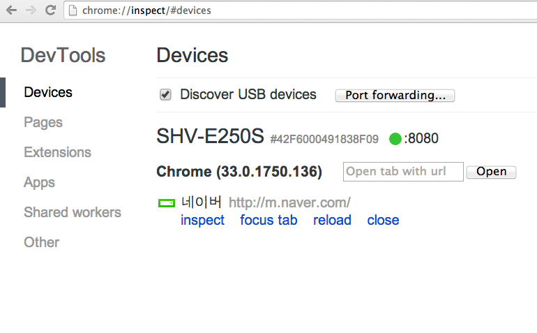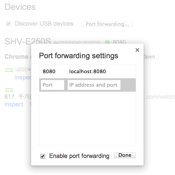 PC에서 개발중인 localhost 서버를 모바일웹에서 볼 수 있습니다. 먼저 PC의 크롬을 열고 주소창에 chrome://inspect 을 입력해서 접속 한 후 ‘Port forwarding’ 이라고 나오는 버튼을 누르면 8080 이라는 부분이 설정되어 있습니다. 만약 8080 포트로 서비스중인 로컬 서비스가 있다면 바로 안드로이드 브라우저에서 PC의 로컬서비스에 접속해서 테스트 할 수 있습니다.