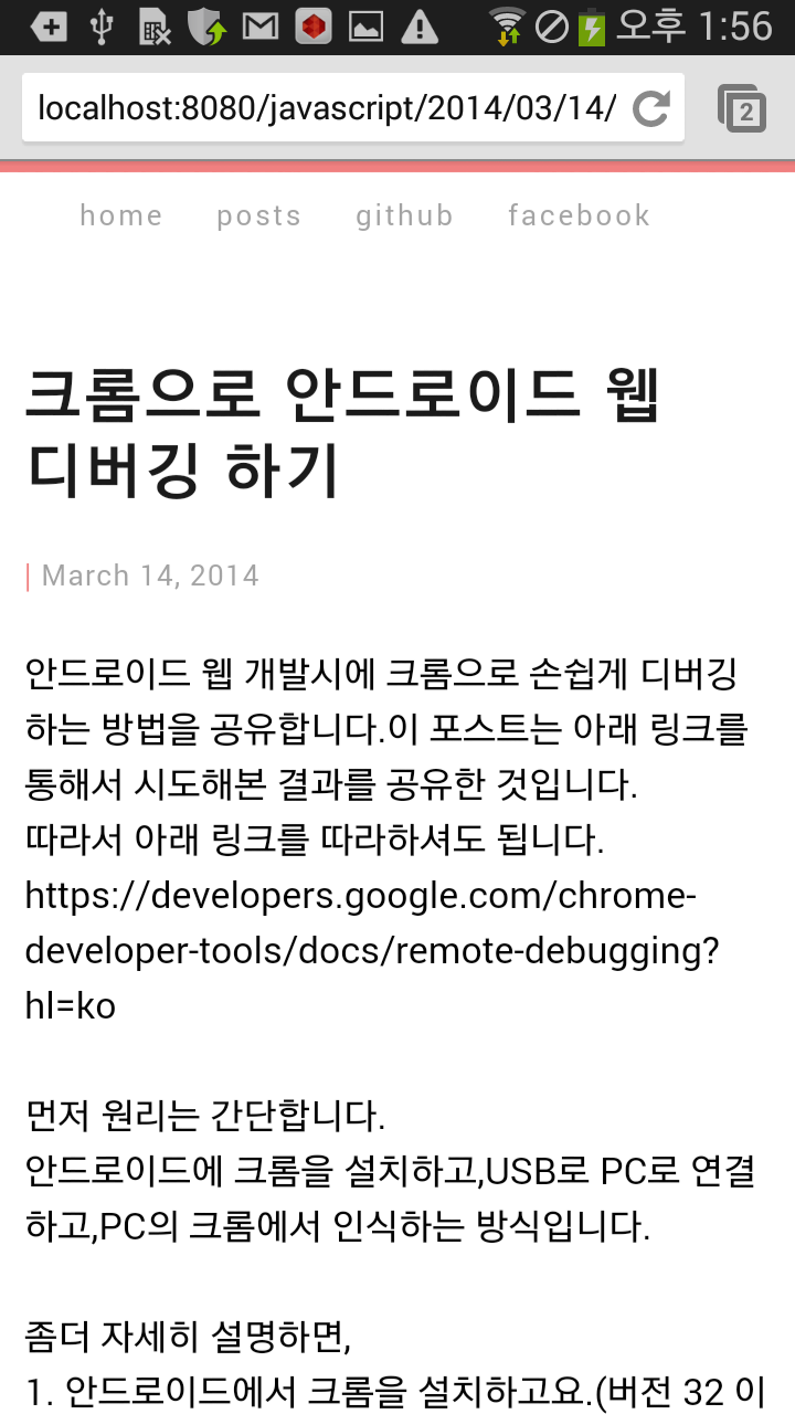 안드로이드 웹 개발시에 크롬으로 손쉽게 디버깅 하는 방법을 공유합니다.이 포스트는 아래 링크를 통해서 시도해본 결과를 공유한 것입니다. 따라서 아래 링크를 따라하셔도 됩니다. https://developers.google.com/chrome-developer-tools/docs/remote-debugging?hl=ko 먼저 원리는 간단합니다. 안드로이드에 크롬을 설치하고,USB로 PC로 연결하고,PC의 크롬에서 인식하는 방식입니다. 좀더 자세히 설명하면,