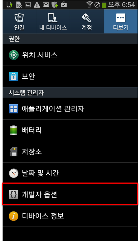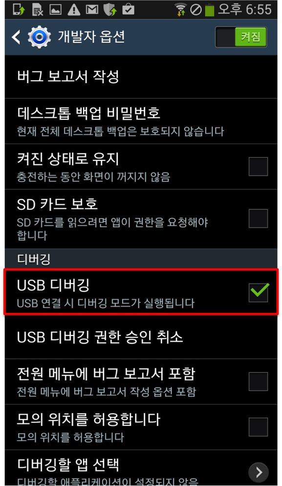 3. 안드로이드 환경설정에서 개발자옵션을 켜고, USB디버깅을 활성화