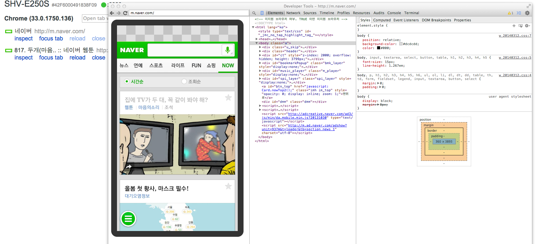 inspect 를 클릭해보세요. 크롬개발자도구가 나오면서 모바일웹화면의 DOM을 분석 할 수 있습니다.