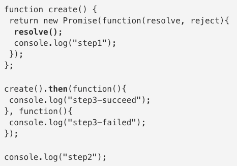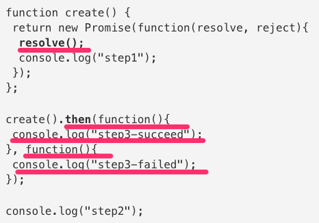 [3] return을 통해 생성된 인스턴스를 반환합니다. resolve()는 나중에 호출할 수 있는 환경이 되면 실행됩니다. function create(){...}가 끝나면 console.log('stetp2')가 실행된다.
