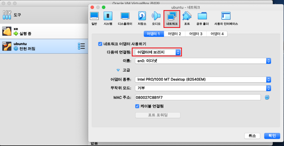 가상 환경시, NAT네트워크를 통해 포트만 열어주어도 되지만, 저는 브릿지모드로 사용하여 vm-우분투에 직접 IP를 할당하고 사용하도록 하겠습니다.
