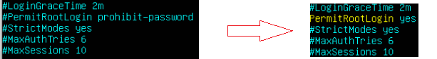 편집기를 이용하여, #PermitRootLogin prohibit-password 부분을 # 주석 제거 후 yes로 변경합니다.