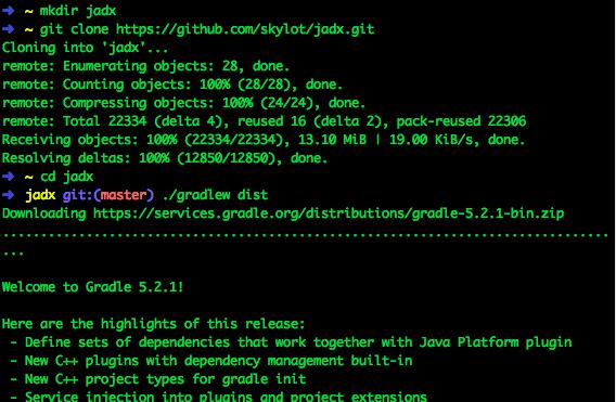 Install Jadx decompilation tool on Mac Ready to work step 01 clone warehouse compilation mkdir jadx #Create jadx directory git clone https://github.com/skylot/jadx.git #Clone the repository to the directory cd jadx # Enter the jadx directory ./gradlew dist