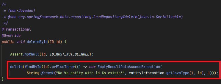 또한 내부적으로 id에 대한 null 체크를 해주기 때문에 서비스 로직에서 id의 null 체크를 하지 않았더라도 의도치 않은 NullPointerException 발생을 예방할 수 있다.