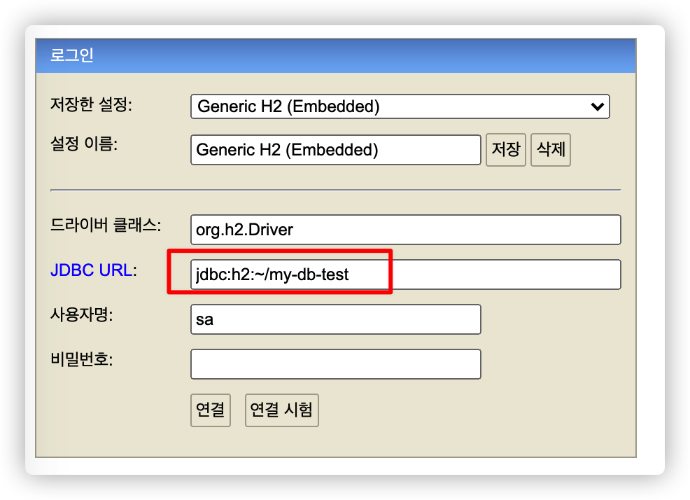 이후에 다시 h2 console 에서 연결 끊기 후 jdbc:h2:tcp://localhost/~/my-db-test 로 접속해서 사용하면 됩니다.