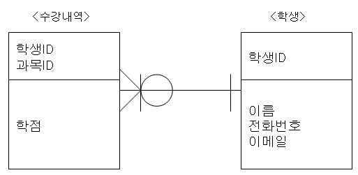위의 학생 테이블과 수강내역 테이블과의 관계를 나타낸 ERD를 예로 들어보겠다.