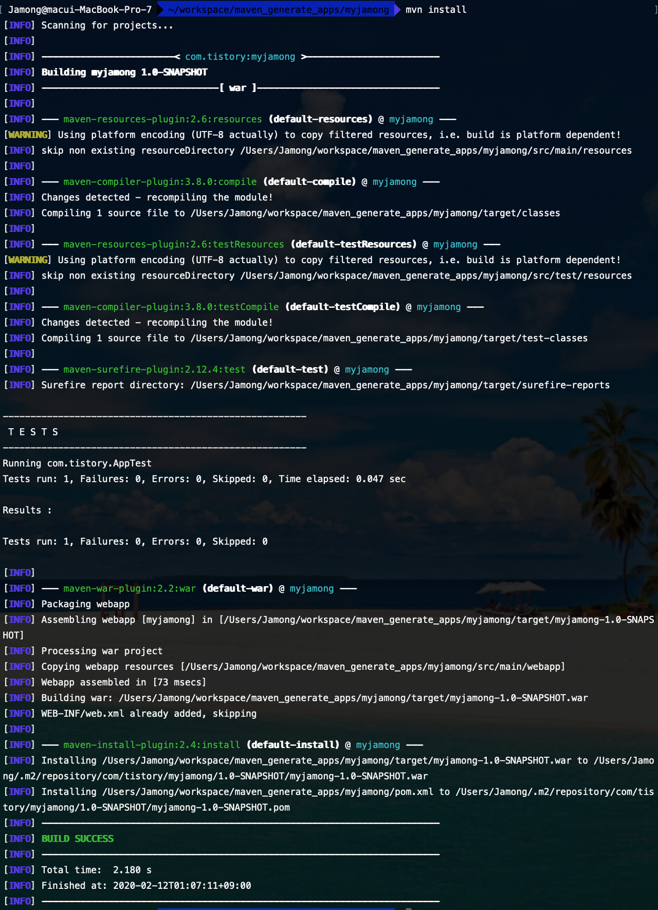 다음은 install 명령을 통해 라이프사이클대로 모든 phase를 진행합니다.