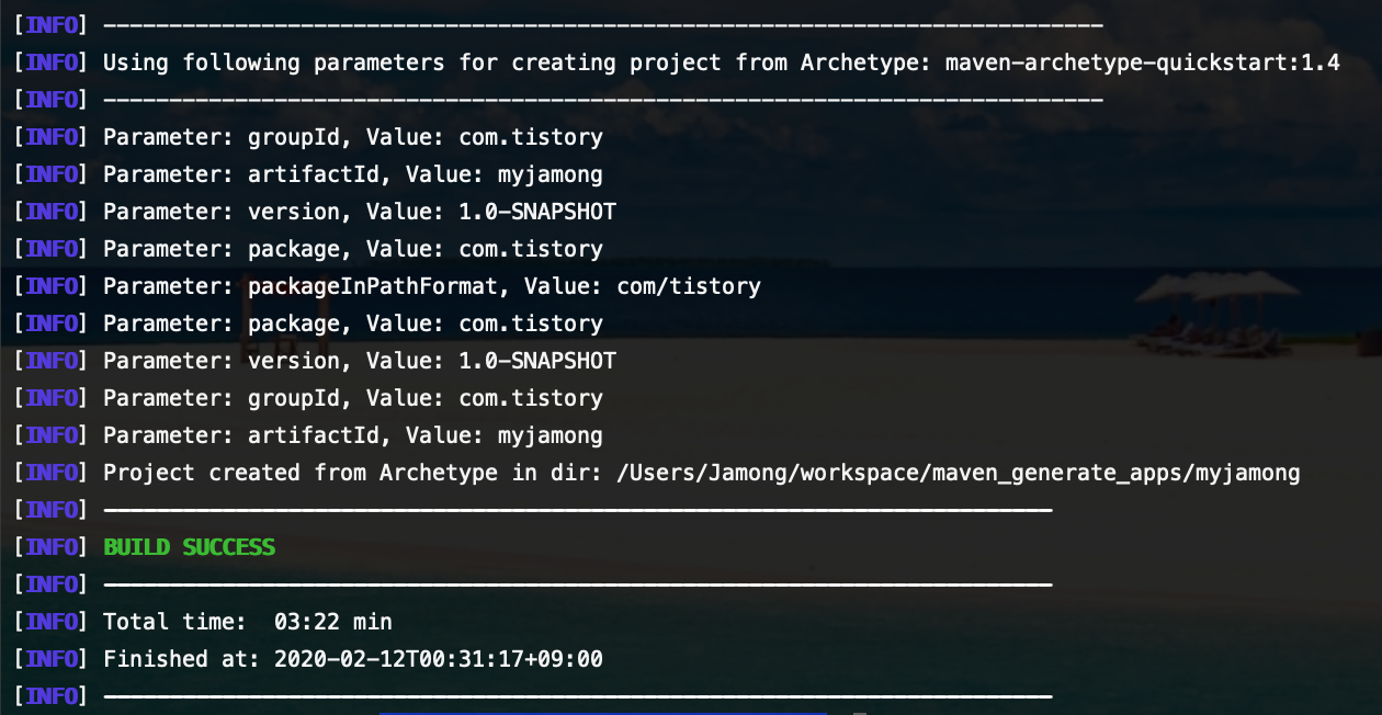 이상없이 모든 단계가 다 끝나면 아래와 같이 BUILD SUCCESS 로그가 남고 artifactId명으로 폴더가 생성된 것을 확인 할 수 있습니다.