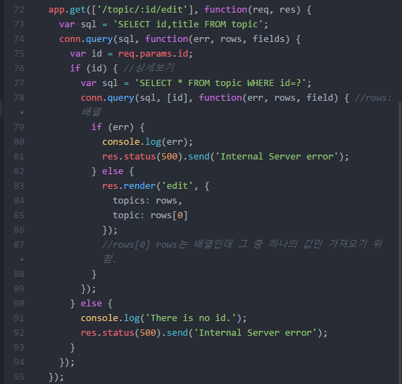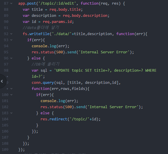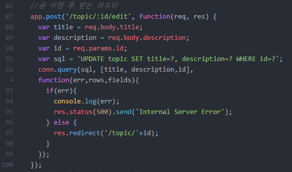 Line 88,89,90 : 수정한 데이터 = 파라미터 받기 (제목, 내용) 주소창에 있는 id값 가져오기. req.params.id ★
