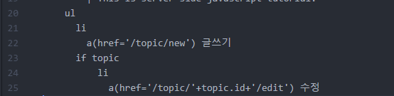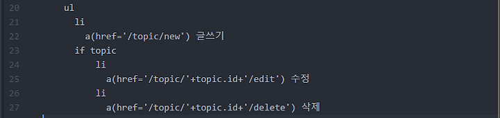 Line 26-27 : edit 버튼과 동일하기 특정 글을 보고 있을 때 나타나야 한다. view.jade 코드 추가