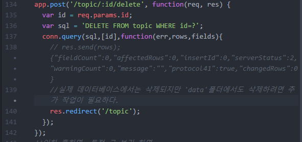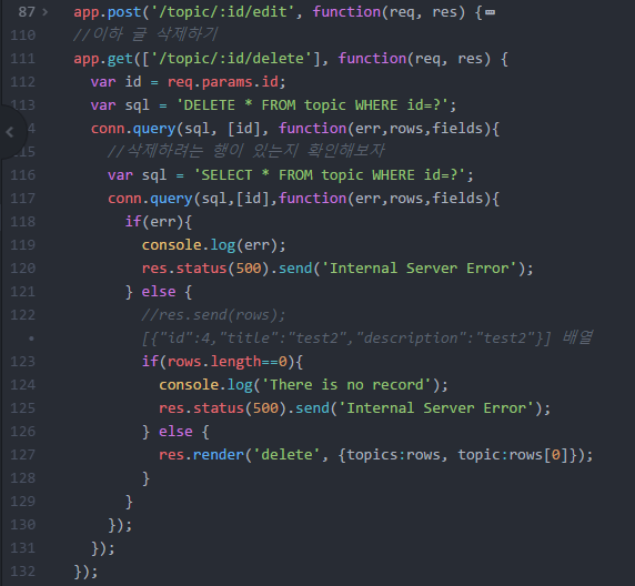 Line 111 : (view.jade에 추가한 삭제 버튼 링크에 대한) 라우터 추가