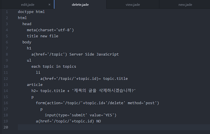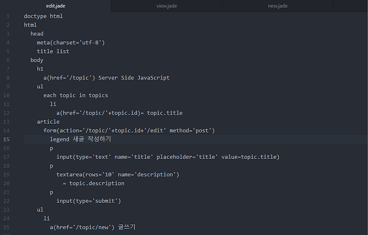 Line 14 -22 : 글을 가져와서 읽는 부분을 new.jade에서 사용한 폼을 가져와 쓴다.