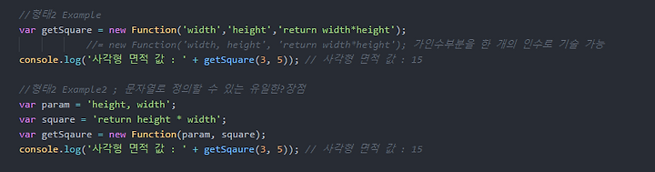 But, 중요한 특징! 인수나 함수를 '문자열'로 정의할 수 있는 점. (다만 남용X, 함수는 기본적으로 형태1,3번을 사용한다고 기억하자)